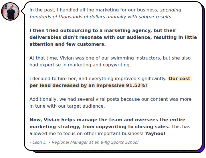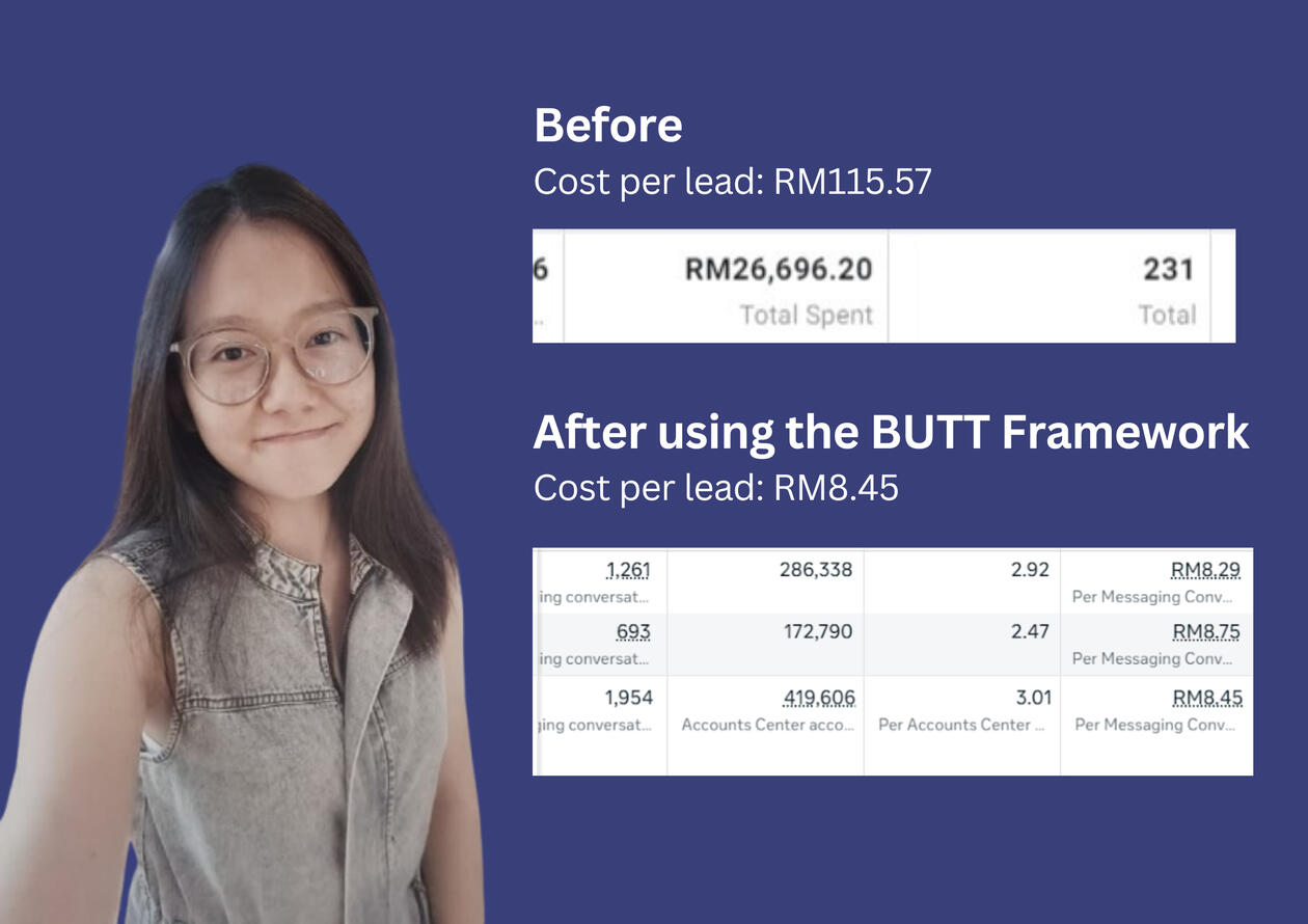 BIG DISCLAIMER:My client's results above are backed by their own amazing offers. They have established their credibility in their industry for more than a decade.They know what they're doing, and they are good at it.They just need some help (from yours truly, ME ;) to help them market and position themselves in the most cost-effective and least time-consuming way.So, don't come at me and scream:"Where is my lead? I want them ChEaP!"This is possible when you have put in the work to make your services as awesome as possible.Then you implement my strategy in the BUTT ad framework.I want you to read it, execute it, and then get amazing results as soon as within 1 week.That's how it's done.Now, what are you waiting for?Just put in your primary email address & get my FREE ad framework.So you can stop wasting money on expensive leads.